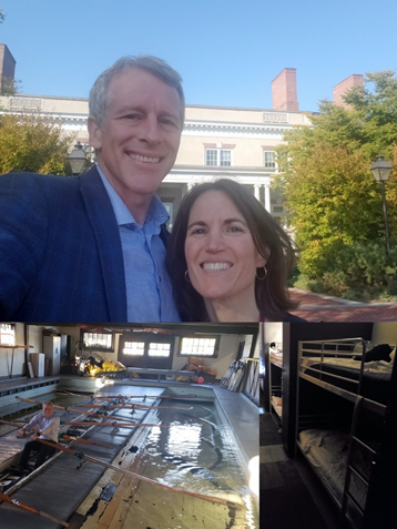 4) It was great catching up with old friends at the reunion, and I can proudly say with a high degree of certainty that I was the only person there who stayed in a youth hostel (the one night my wife wasn't there) – LOL! Here are pictures of my wife and me, practicing rowing in the Harvard crew team's 119-year-old indoor tank, and my lovely bunk bed at the HI Boston Hostel: