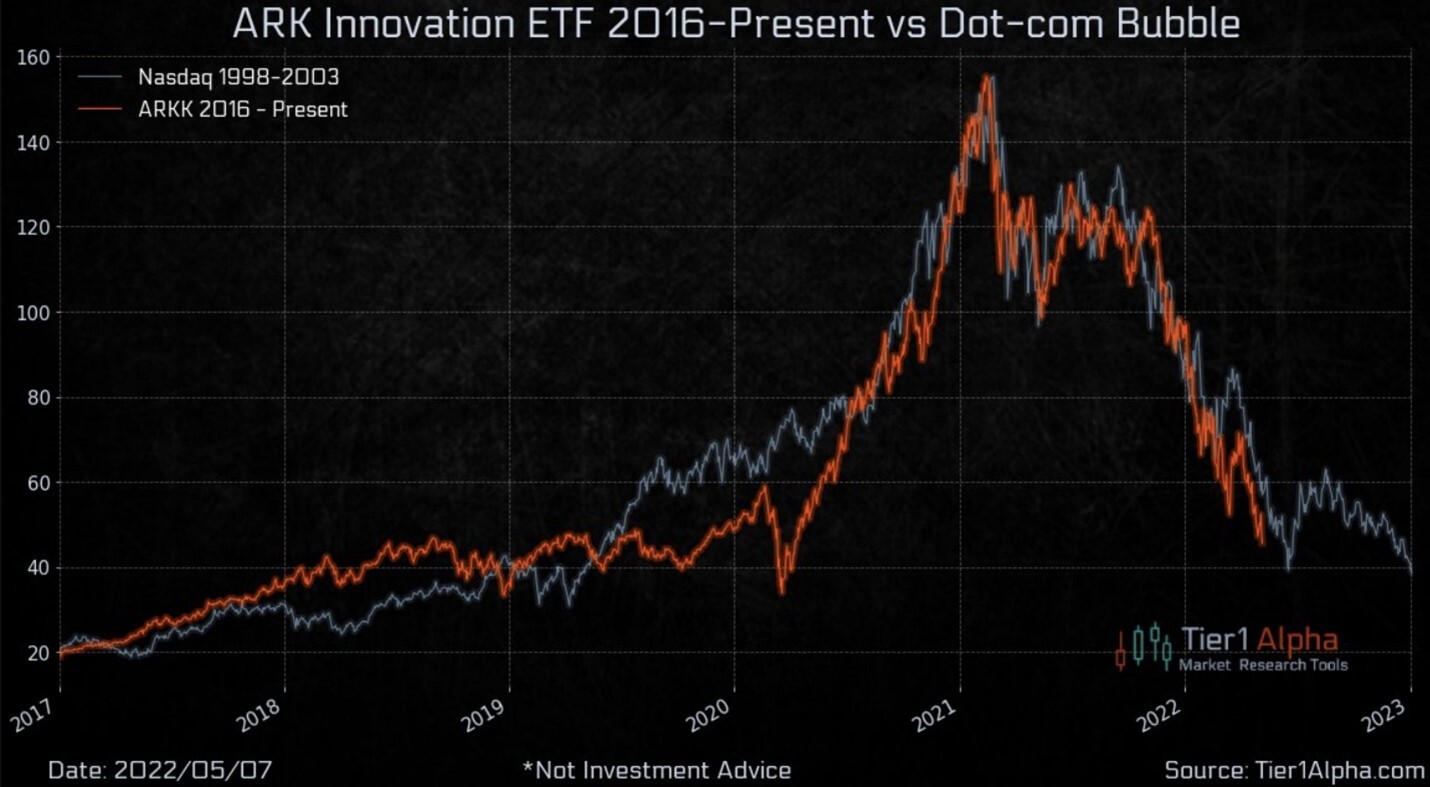 3) It's remarkable how the current crash in high-growth stocks, embodied by Cathie Wood's ARK Innovation Fund (ARKK), mirrors the tech-stock bubble of the late 1990s.