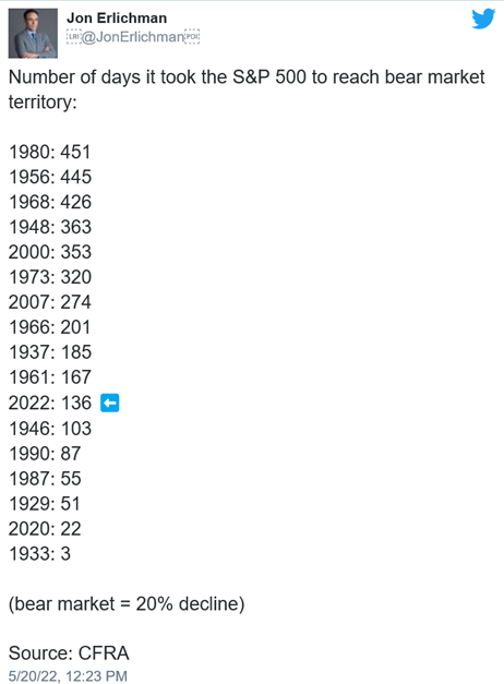 And on Friday, the market briefly dipped into bear market territory – defined as a 20% decline from a previous high – making it the seventh fastest decline in history (the COVID-19 crash was second fastest):