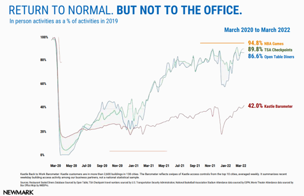 4) Commercial real estate firm Newmark (NMRK) has a fascinating chart showing that the number of people flying, going out to eat, and attending NBA games is nearly back to normal, but the number going back to the office is still down 68%! Take a look: