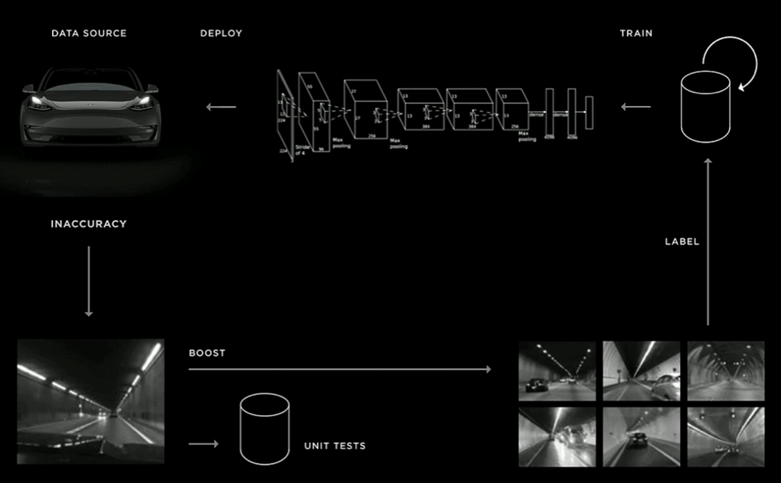 Tesla's cars are everywhere gathering data, but not all the data coming from its fleet are useful. Tesla has mechanisms to source and curate the most useful data through a trigger infrastructure that flags examples when the neural net is uncertain, or a driver intervenes and takes over. Also, it can gather from the dataset a large collection of images of a particular object that is confusing the neural network – a bike on the back of a car, for example. Then, it can correctly label these images, incorporate them into the dataset, retrain the network, redeploy, and iterate repeatedly – a process it calls the "data engine."