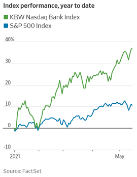 Additionally, I bought a basket of six other bank stocks – Bank of America (BAC), Morgan Stanley (MS), Citigroup (C), JPMorgan Chase (JPM), U.S. Bancorp (USB), and Bank of New York Mellon (BK) – in my personal account on March 17 last year, within a week of the market bottom... And these are up an average of 95% versus 64% for the S&P 500. I continue to hold them for reasons that this Wall Street Journal article outlines: U.S. Bank Stocks Shine as Investors Bet on an Economic Recovery. Excerpt: