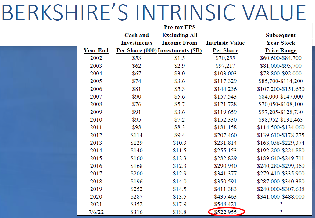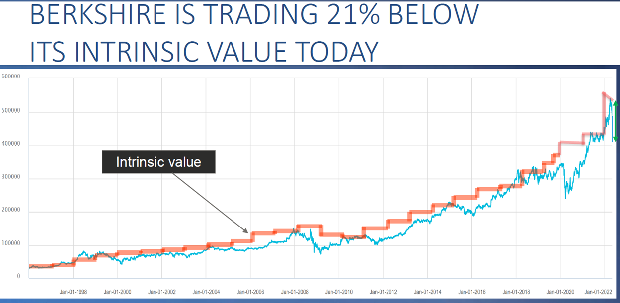 We're publicly releasing the Berkshire slides, which you can download right here. This slide shows my estimate of Berkshire's intrinsic value over the past two decades and today: