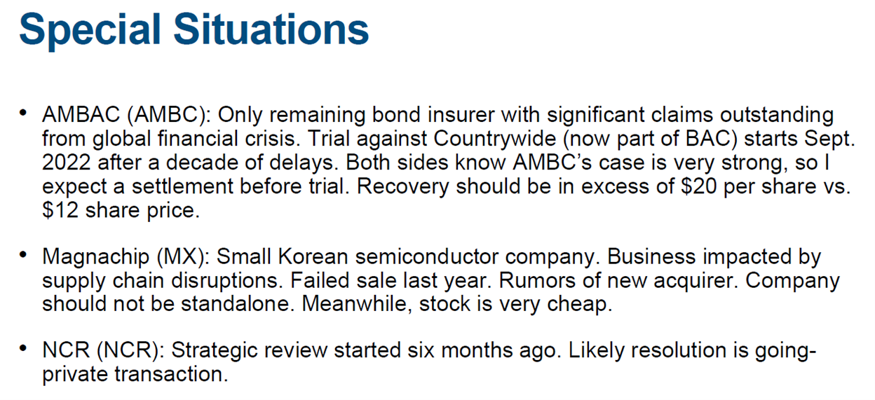 They both, as we say in the industry, have a lot of "hair" on them... and I'm certainly not recommending that anyone buy either one. But for anyone comfortable with this kind of investment, they're certainly worth a look – they're among the cheapest stocks I've ever seen, and Tiago made a compelling case that they've made big positive changes and thus aren't the value traps they've always been. Here's one slide: