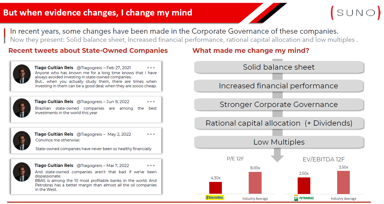 4) Tiago Reis of Suno Research in Brazil (here's his LinkedIn profile and here's a video of an interview he did in April) gave an interesting presentation (slides here), pitching two state-owned giants whose stocks trade in the U.S., oil company Petrobras (PBR) and Banco do Brasil (BDORY).
