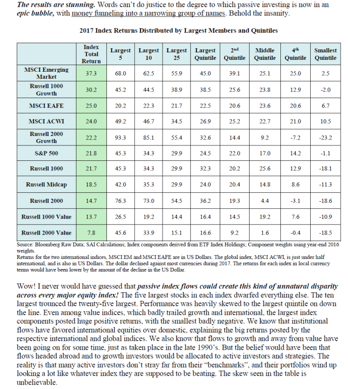 And this chart shows how the return of every major market index is being driven by a handful of the largest companies thanks to indexing: