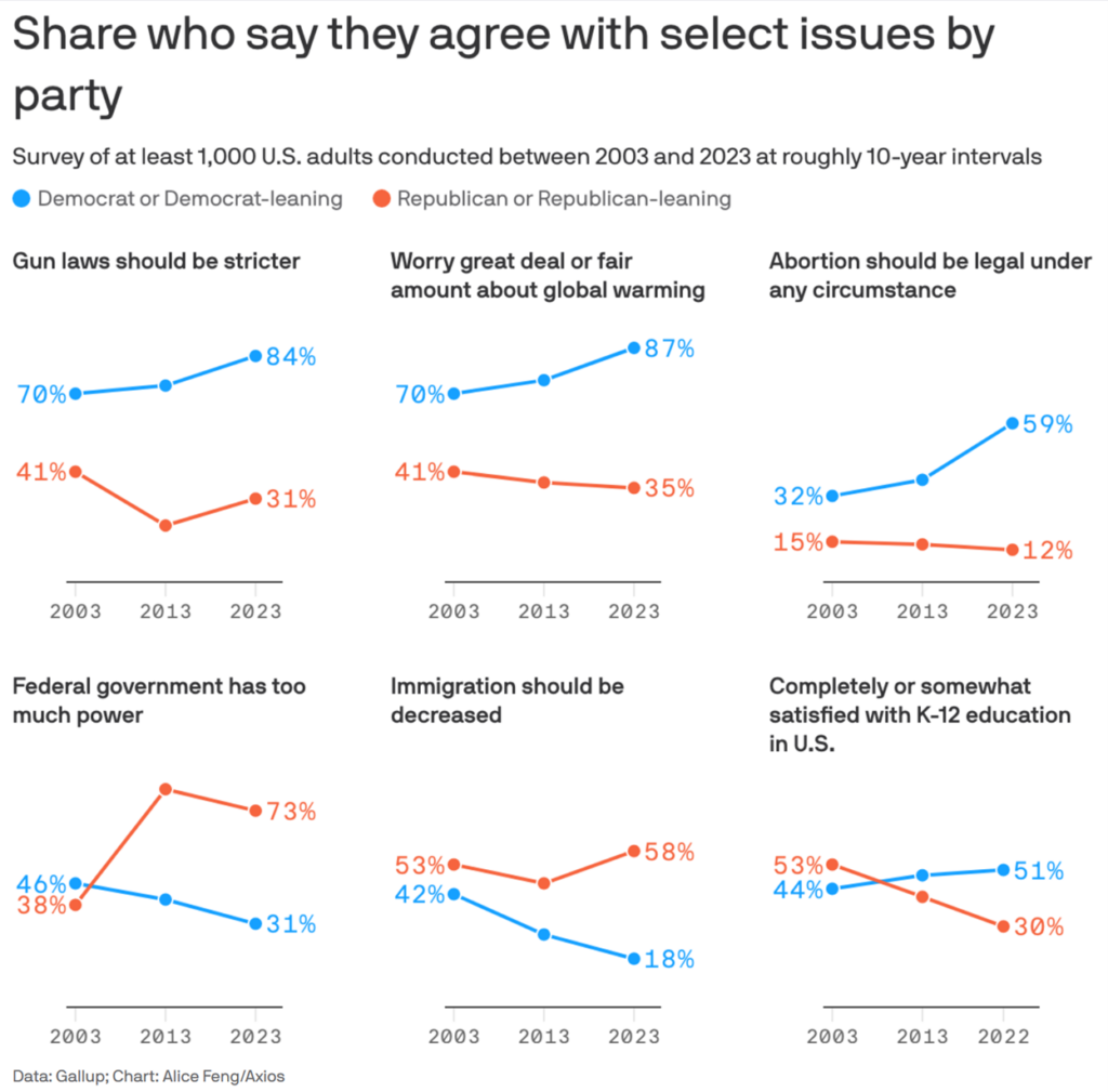 6) Wow, it's really shocking how much more politically polarized we've become over the past two decades, as these charts show: