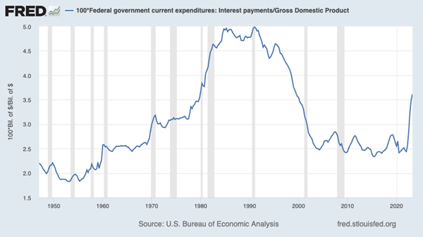 So what might make people suddenly concerned about U.S. debt? One thing that has attracted considerable attention lately is rising interest payments. The Federal Reserve has been raising rates to cool off inflation, and this has translated into a spike in government interest payments both in absolute terms and as a percentage of GDP: