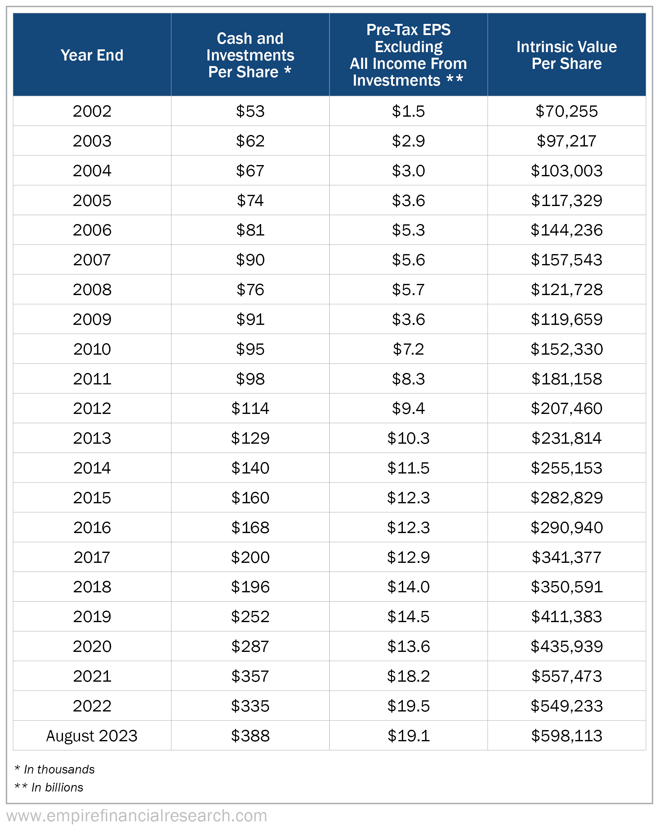 I've used a consistent method to estimate Berkshire's intrinsic value for the past two decades, which I believe is similar to the one Buffett uses: take the cash and investments per share and add the value of the operating businesses.