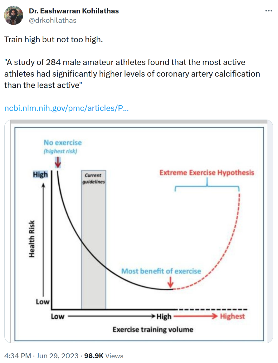 A very interesting tweet that summarizes the research I've seen: there are tremendous benefits to exercise (and not just this area, coronary artery calcification), but at the extreme tail (this chart makes it look like top 30%, whereas I'd say it's top 1%), too much exercise can be bad for you...