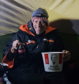 Here are three pictures of me after the race with my team (and our "pit crew" – my friend's son – on the left); happily welcoming the sunrise after a long, cold night; and bundled up, trying to stay warm in my wet outfit, chowing down on KFC and Coke (getting lots of calories, salt, and sugar into my body is key to maintaining a high energy level during such a long race):