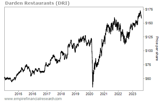3) My old friend Jeff Smith of activist hedge fund Starboard Value made shareholders a lot of money with his campaign beginning in 2014 that targeted Darden Restaurants (DRI), which operates under many brands including Olive Garden and LongHorn Steakhouse, as you can see from this chart: