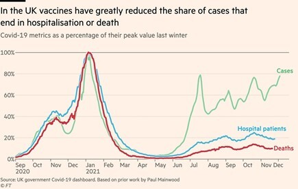 But high case loads from rapid replication and escaping antibodies is only half the story. It's essential that we remain out of the hospital. Immunity has positively and drastically impacted hospitalizations prior to Omicron. Below is a graph from the U.K. showing the fanning effect: cases differentiated from hospitalizations and deaths after vaccines were rolled out.
