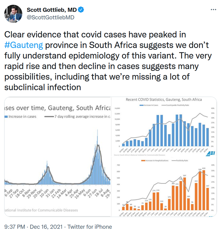 Former FDA commissioner Scott Gottlieb tweeted some good news from South Africa ("missing a lot of subclinical infection" means that many people who get infected have such mild symptoms that they don't even get tested):