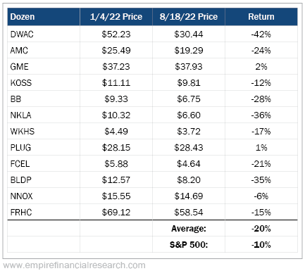 Now that BBBY has cratered, GME is back among my top three stocks to avoid, along with Digital World Acquisition (DWAC) and AMC Entertainment (AMC), as I outlined in my "Dirty Dozen" e-mail on January 4. Here's how that basket has (under)performed since then: