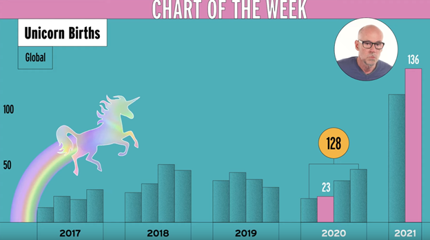 2) Galloway also posts a weekly Chart of the Week. Here's a one-minute video about the latest, Year of the Unicorn, which shows that there were more new unicorns (private companies valued at more than $1 billion) in the second quarter of this year than in all of 2020 combined: