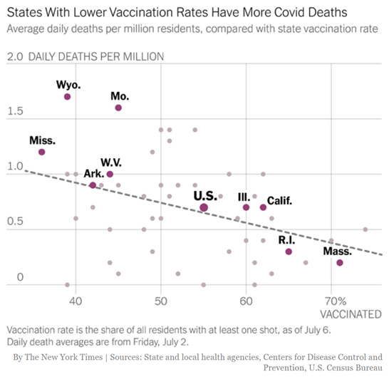Sadly, the vaccination rate variation by state is highly politicized: the 21 states with the highest vaccination rate were all blue in the last election (Nebraska was the top red state), whereas the lowest eight states (and 18 of the bottom 19 – the lone exception was Georgia) were all red.