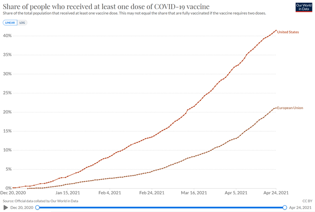 Right now there's a huge disparity in the vaccination rates between the U.S. and Europe, as you can see in this chart (source):