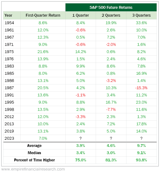 In the table below, you can see how the market performed through the rest of the year after a first-quarter S&P 500 gain of at least 5%...