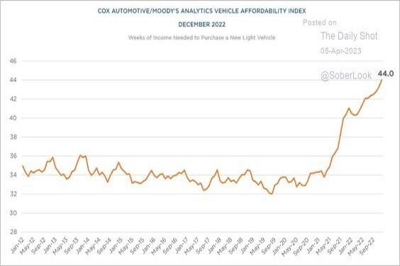 The affordability of durables (automobiles and homes) has deteriorated. 16.8% of consumers who financed a new vehicle in Q1 2023 committed to a monthly payment of $1,000 or more – a new all-time high according to Edmunds – compared to 10.3% in Q1 2022 and 6.2% in Q1 2021: