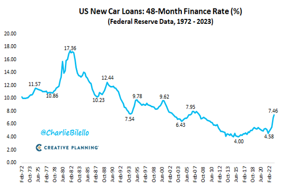 The average interest rate on 48-month new car loans has moved up to 7.46%. That's the highest we've seen since 2007. A year ago the rate was 4.87%: