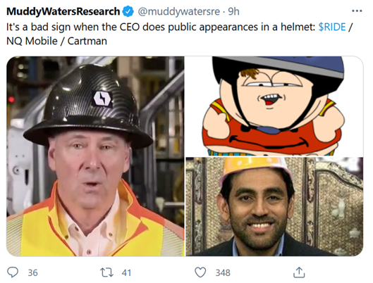 7) Lordstown Motors (RIDE) fell 14% on Thursday on this news: Lordstown Motors Says It Is Cooperating with SEC Inquiry. The CEO went on CNBC that day and lied his a** off – just watch him bob and weave... Here's Muddy Waters' tweet about it:
