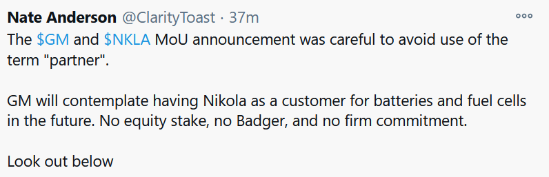 GM stuck the knife into Nikola this morning, so that story is now over. What a total joke. The September 8 deal is cancelled, and replaced by a deal where they will discuss the possibility of GM becoming a supplier for Nikola's class 7/8 semitrucks *if* Nikola pays for all capex up-front. No more Badger pickup truck. This is the end for Nikola. You can set the timer to the bankruptcy at an hour ago.