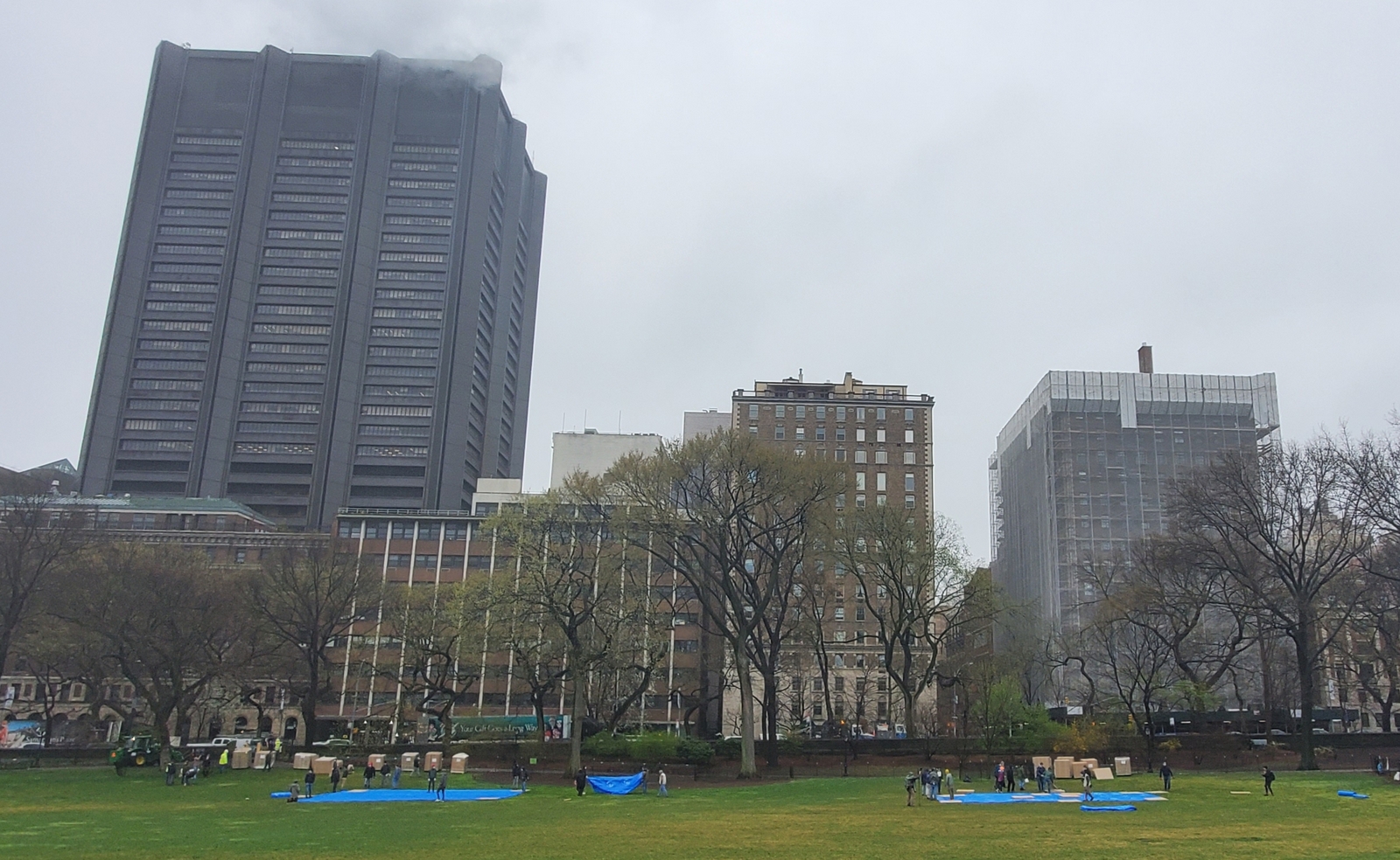Susan and I had noticed it when we were walking Rosie yesterday morning – here's what it looked like (the left half of the picture is Mt. Sinai Hospital. Our building is on the right, covered in mesh):