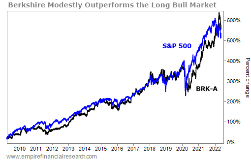 As you can see in the chart below, Berkshire has closely tracked the S&P 500 since the bottom of the market during the global financial crisis in March 2009, which isn't surprising in light of the company's size and diverse holdings: