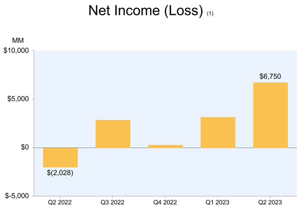 Net sales rose a healthy 11%, but the real story was earnings, which reversed from a $2.0 billion loss in last year's second quarter to a $6.75 billion profit – nearly double what analysts were expecting – as you can see in this slide from the company's presentation: