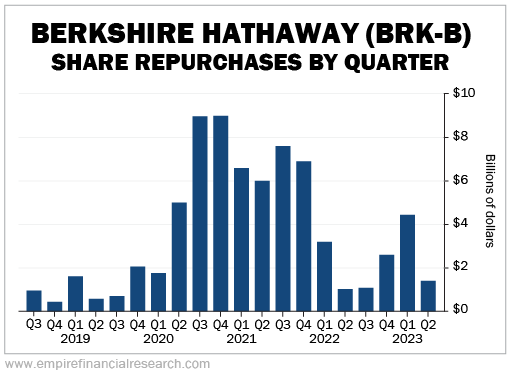 Buffett started buying back shares in 2018 and really ramped it up in 2020 and 2021. He slowed buybacks to a trickle in early 2022 as Berkshire's share price hit an all-time high (and briefly reached our estimate of intrinsic value)... but as the stock (and markets) pulled back, he resumed buying in size in late 2022 and the first quarter of this year, before pulling back to as you can see here: