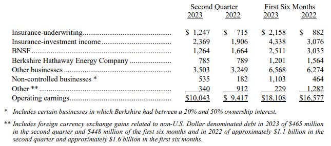 Berkshire's operating earnings growth was actually much stronger than it appeared because, if you read the second footnote above, foreign currency gains in Q2 2023 were $465 million, compared to $1.1 billion in Q2 2022. If you adjust for this, year-over-year was a much more impressive 14.6%!