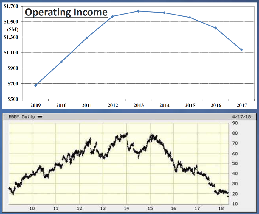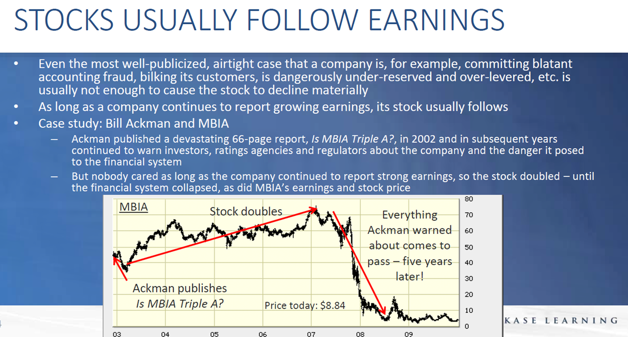 These next slides make the point that stocks usually follow earnings (with six case studies), so the key to successfully shorting (or going long!) a stock is to be right about the direction of reported earnings (not, to be clear, where you think earnings might be at some time in the future):