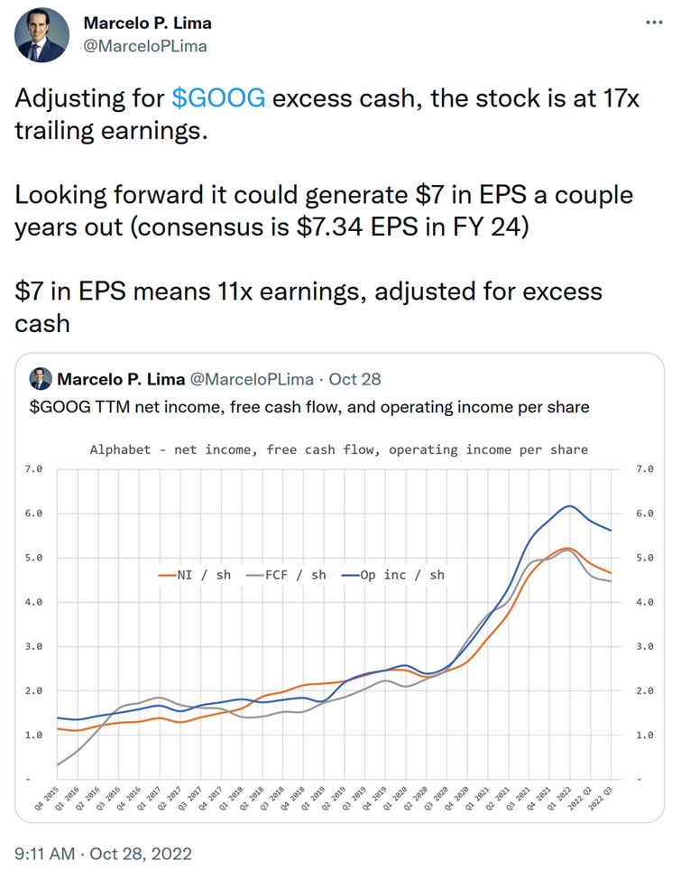 2) I neglected to send this out when my friend Marcelo Lima of hedge fund Heller House tweeted it, but I think his point that Alphabet (GOOGL) is cheap remains true today: