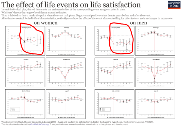 4) This is a very interesting chart on the effects various events have on life satisfaction, which I found on the Our World in Data website on Happiness and Life Satisfaction. The good news is that humans are, overall, surprisingly resilient. But in one important area, long-term unemployment, we're not...