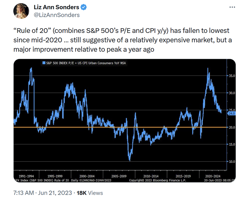 3) I've never heard of the "Rule of 20," but it makes sense that when both the S&P 500's P/E ratio and inflation are high (meaning the Fed is likely to start raising rates), which was the case at the end of 2021, look out below for stocks! It's interesting to see that this indicator has pulled back substantially, though it's still above its historical average: