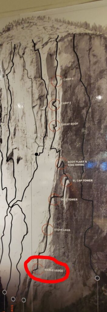 My guide and I climbed up the first six pitches (each approximately 100 feet) and stashed a heavy bag with seven gallons of water on Sickle Ledge (circled in the first picture below, which shows the entire route and eight major features). Then we rappelled down three long ropes, which we left in place so that the first stage of our climb will be faster tomorrow. Our goal is to make it through the Stove Legs and get to Dolt Tower or maybe even El Cap Tower to spend the first night.